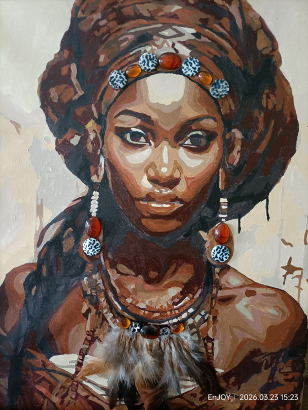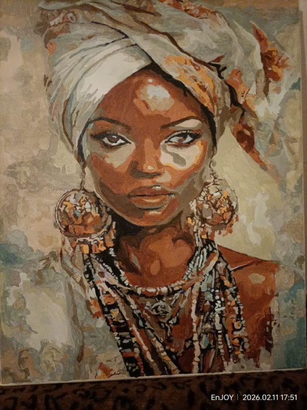 Schilderij 1, 50x40cmHandgemaakte werk, op kleur geschilderd Afrikaans portret op doek van 40 x 50 cm.